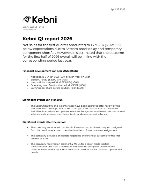 • The company provided an update regarding the financial outcome for the first quarter of 2026. • The company received an order of 5.2 MSEK for a tailor-made inertial measurement unit from a leading manufacturing company. Deliveries will commence immediately and be finalized in 2028 or earlier based on operational needs.