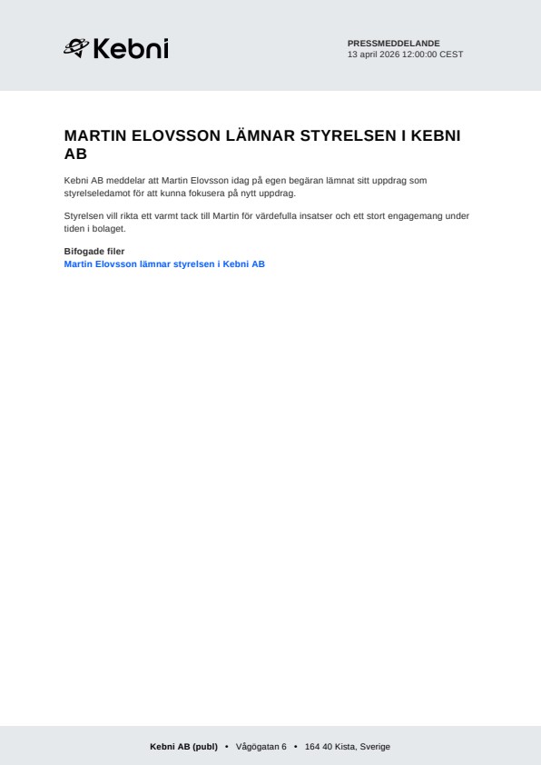 Kebni AB meddelar att Martin Elovsson idag på egen begäran lämnat sitt uppdrag som styrelseledamot för att kunna fokusera på nytt uppdrag.
